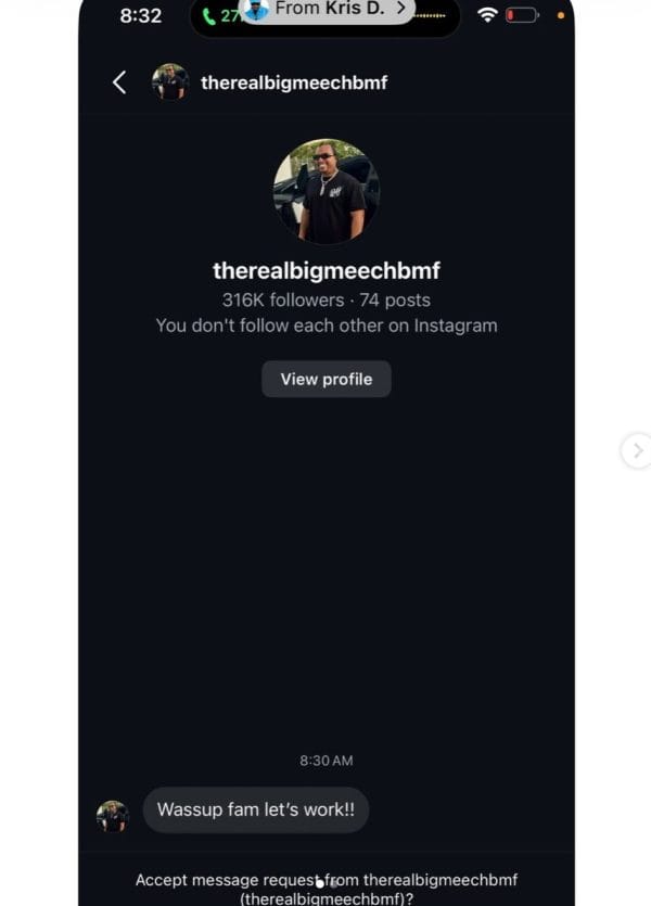 On Tuesday, Dec. 23, the G-Unit founder posted on Instagram after a screenshot circulated showing Big Meech reaching out earlier that day to Kris D. Lofton. Lofton portrays the volatile Chicago drug dealer Jennard Samson on Starz’s Power Book VI: Force. Meech’s message was brief and informal, reading, “Wassup fam let’s work!!”