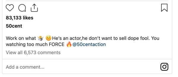 “Work on what ,” 50 wrote. “He’s an actor, he don’t want to sell dope fool. You watching to[o] much FORCE .”