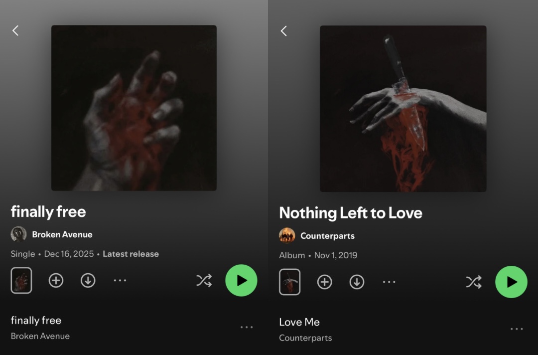 Fans of Counterparts, Knocked Loose, and the Devil Wears Prada say whoever is behind Broken Avenue has generated music and artwork to explicitly mimic those bands. For example, in the image atop this article you can compare the art for Broken Avenue’s new single “finally free” (left) to the cover of Counterparts’ 2019 LP Nothing Left To Love (right).