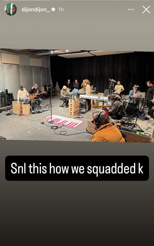 Dijon appeared on Bon Iver’s Grammy nominated SABLE, fABLE this year too, and it’s looking like SNL musical guest alumnus Justin Vernon might join him on the show. Yesterday Dijon posted a photo seemingly from rehearsal with a big squad that included Vernon. (He could just be there for moral support though.) Zack Villere is there too and in the back it looks like Mulherin, the musical brothers who’ve joined Dijon onstage on his current tour. That might be Nick Hakim at the keyboard — he sat in with the band in Brooklyn on Tuesday. The guy on his phone who looks like SNL alumnus Mk.gee is actually bassist Daniel Aged. Dijon previously tagged all touring band members when announcing his SNL debut so we assume that’s Amber Coffman, the lone woman, obscured on the mic. Justin Bieber was at a Tokyo fish market on Tuesday so don’t expect him to show up.